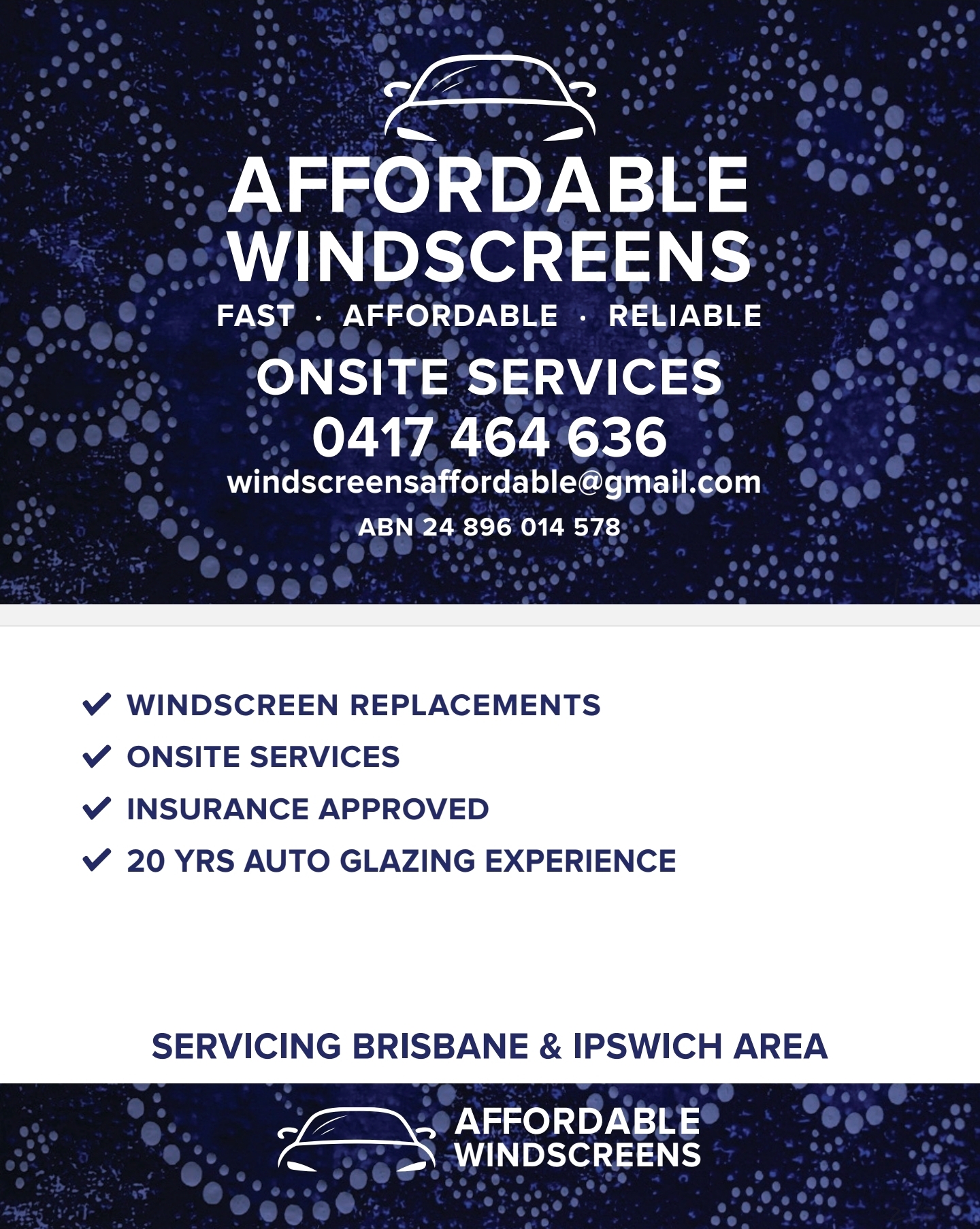 Affordable windscreens is a Brisbane based family owned business, with over 20 years in the Auto Glazing industry. Our aim and goals are to meet the customers needs, always striving to be professional and reliable while not hurting your back pocket.